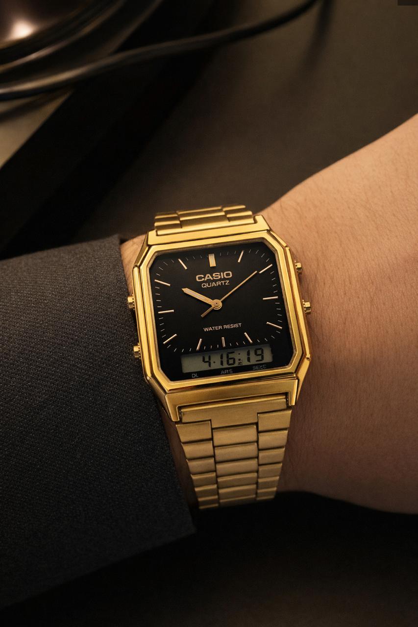 ساعة Casio AQ-230GA بتصميم كلاسيكي أنيق تجمع بين العقارب والشاشة الرقمية، مناسبة للاستخدام اليومي بإطلالة عملية وخفيفة على المعصم، مع سوار ستانلس ستيل ولمسة فاخرة تناسب جميع الأوقات.